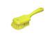 Kunststof afwasborstel met harde gele vezel en korte steel. Afmeting: 245x70x50 mm. Reiniging tot 121° C.