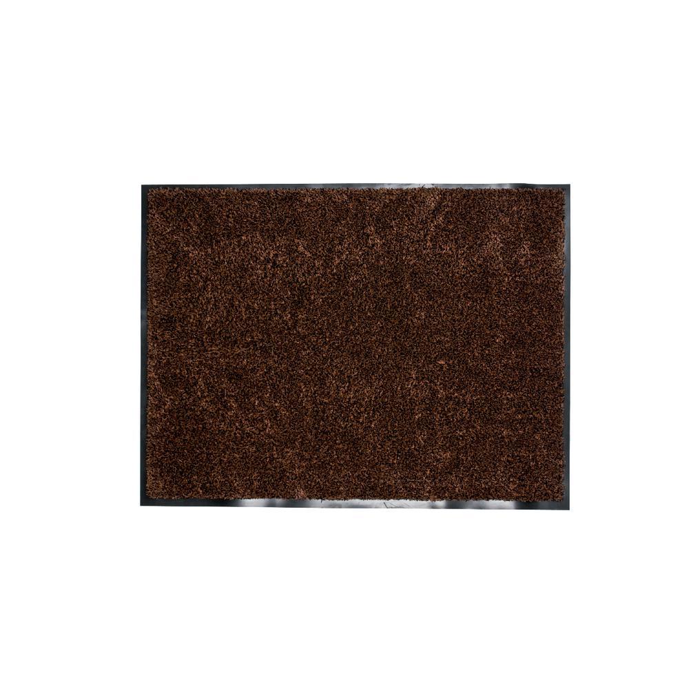 Vloermat van 100% katoen in de kleur bruin, met een poolhoogte van 5 mm en pvc rug van 3 mm. De mat heeft rondom een rand, wasbaar op 30 graden.
