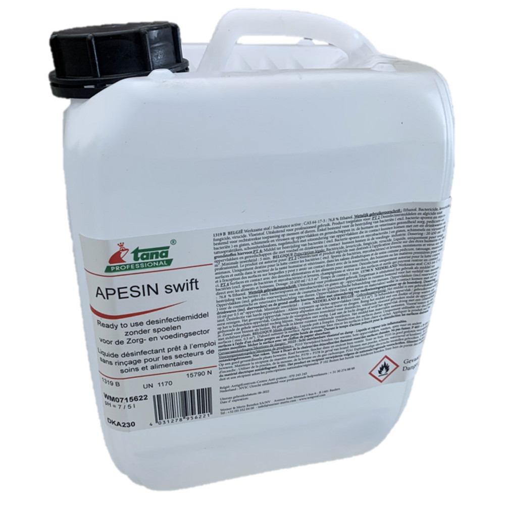 APESIN swift is een gebruiksklaar middel om kleine oppervlakken (0.5 m2) te desinfecteren. Toegelaten in Nederland onder n° 15790N, heeft een afdodende werking voor bacteriën, gisten, schimmels en virussen. Apesin swift is ingedeeld in het „vrije circuit“.