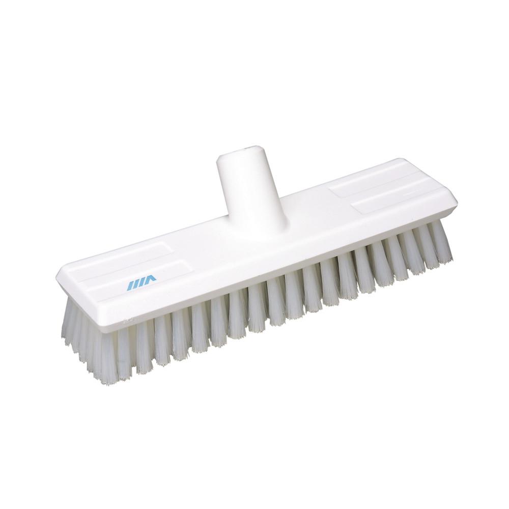 Schrobborstel wit met zachte vezels en waterdoorvoer. Voor reiniging van vloeren en wanden. 65 x 270 mm breed, vezellengte 33 mm.