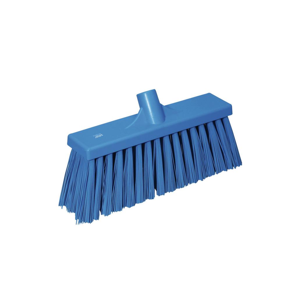 Stevige blauwe bezem met harde vezels, te gebruiken bij grove vervuiling en in natte ruimtes. 69 x 300 mm breed.
