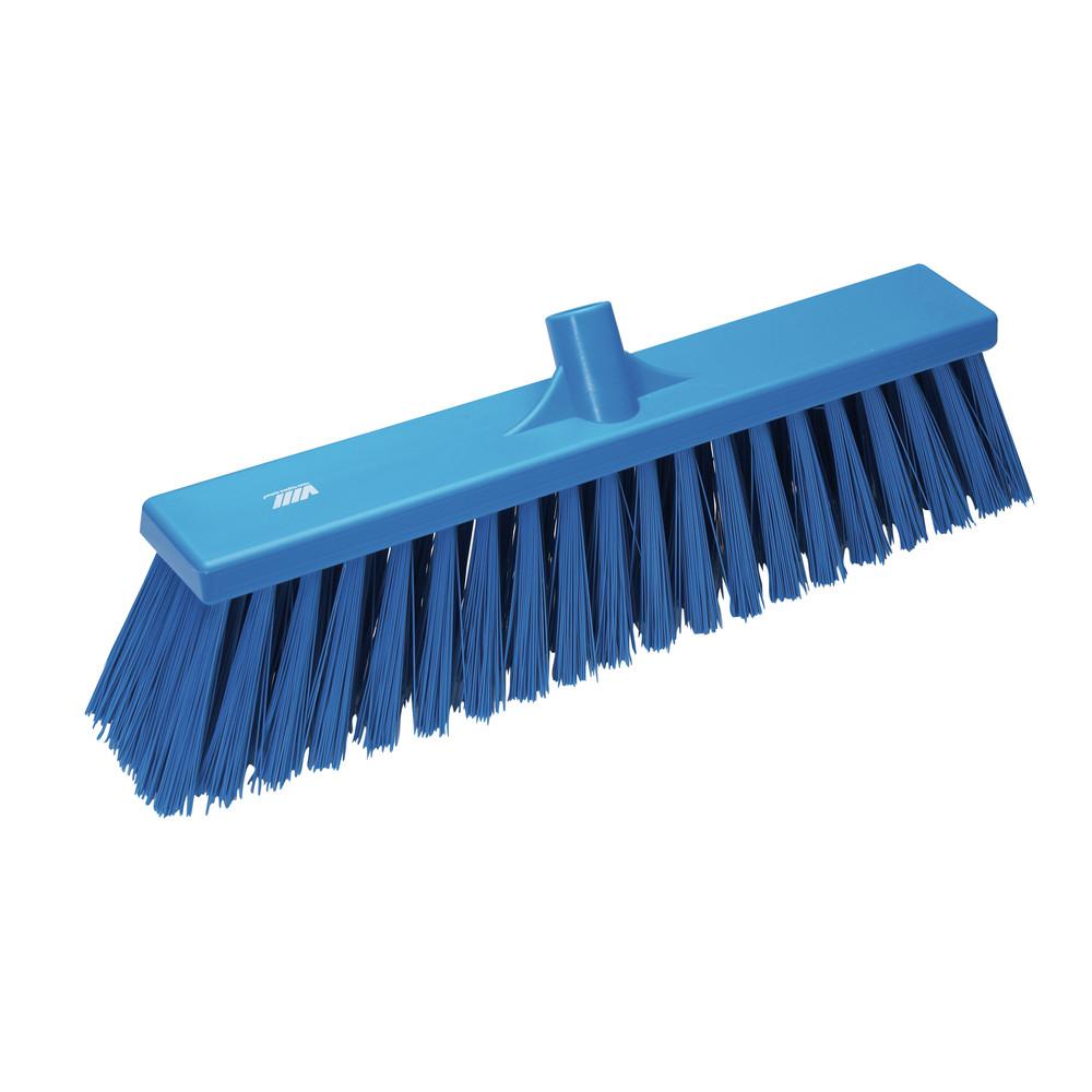 Stevige blauwe bezem met harde vezels, te gebruiken bij grove vervuiling en in natte ruimtes. 69 x 470 mm breed.
