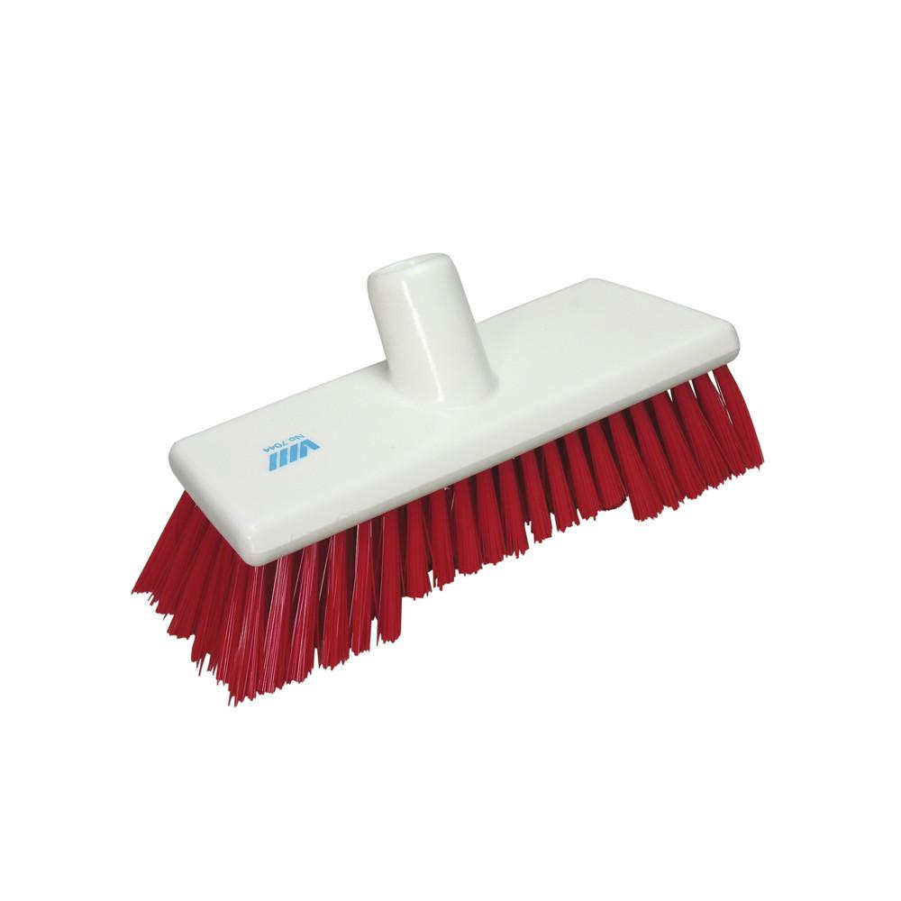 Schrobborstel rood, met harde vezels in verschillende hoogtes, speciaal ontwikkeld voor kleine ruimtes. 70 x 230 mm breed.