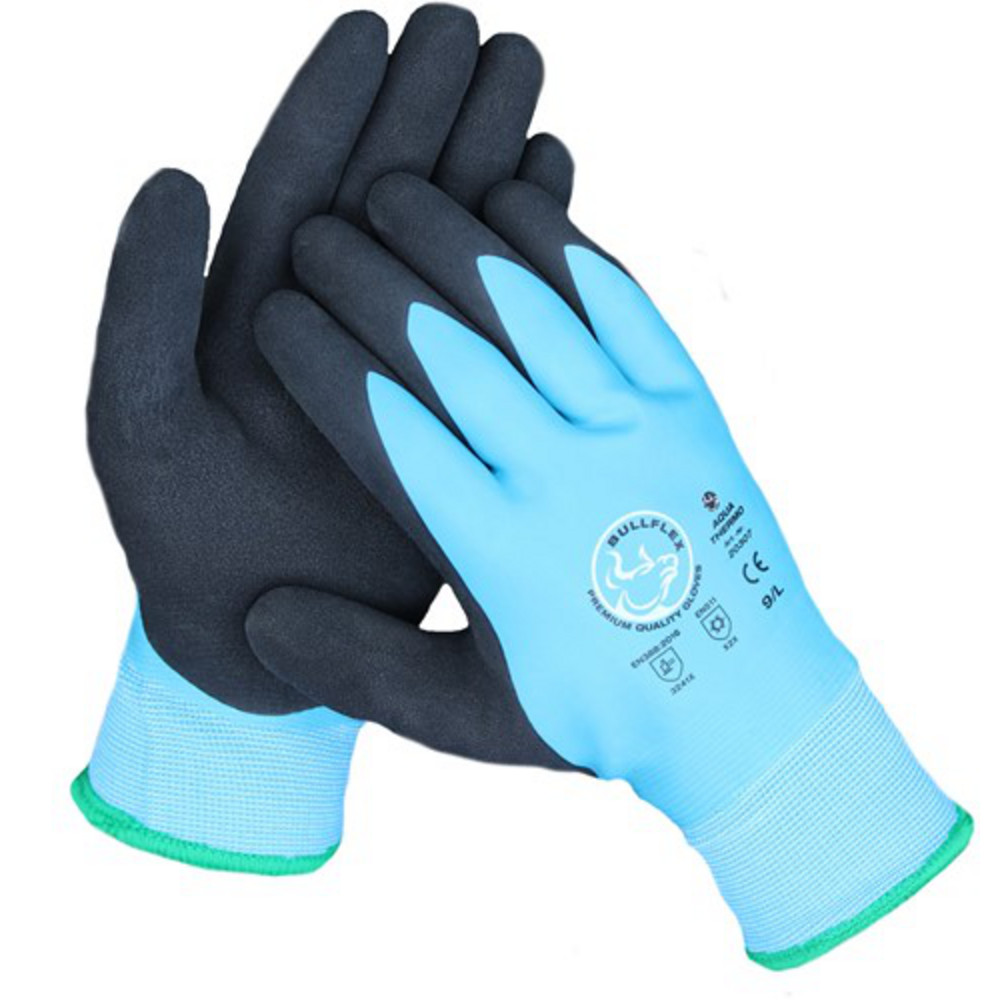 Bullflex Premium AQUA THERMO Quality Gloves zijn ideale werkhandschoenen voor het werken in natte omstandigheden in de winter. De Bull Flex Aqua Thermo heeft een uitstekende grip en is erg flexibel dankzij de latex coating en als pluspunt een 2 cm langere tricot manchet, ideaal om over een boord te dragen en verhoogt het comfort aanzienlijk. Deze Aqua Thermo van Bull Flex heeft een dubbele latex coating waardoor hij waterdicht is en de duim is volledig gecoat wat hem extra duurzaam maakt.