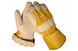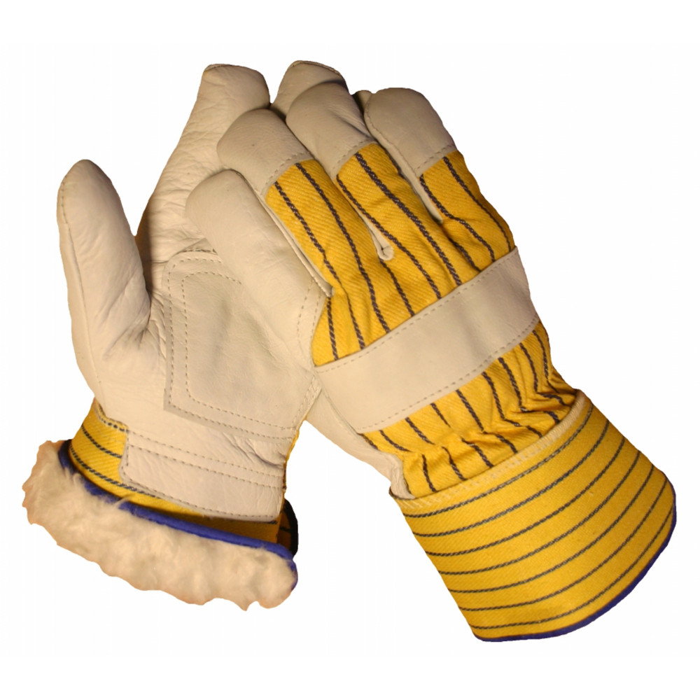 Werkhandschoen A-kwaliteit rund boxleder 1,3 mm dik met warme boa voering, geel/blauw streepdoek en 10 cm kap.